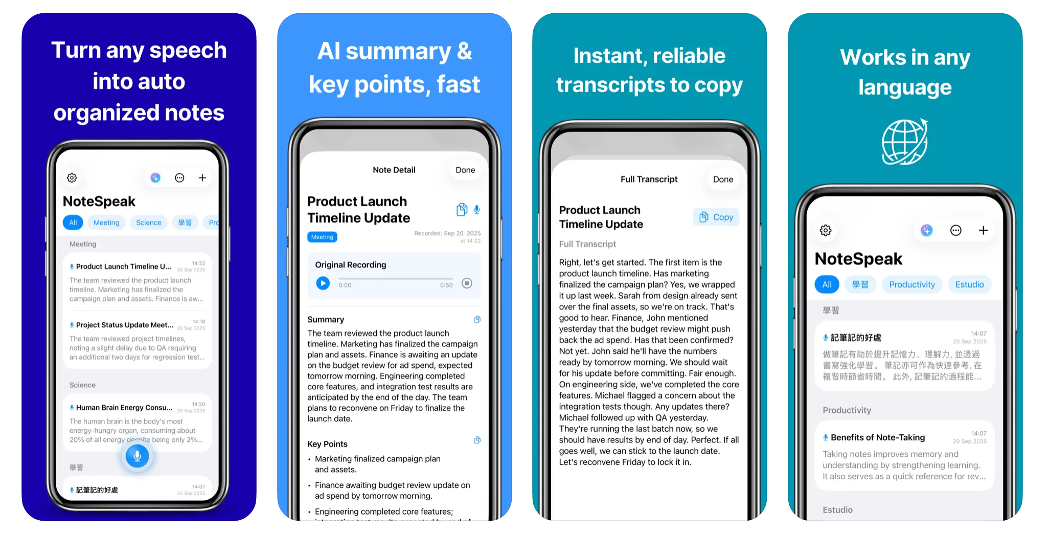 NoteSpeak은 매우 간단합니다. 녹음 버튼을 클릭하면 녹음이 완료되면 제목, 카테고리, 그리고 자동으로 정리됩니다. 원하는 언어로도 사용 가능합니다. 또한, 요약과 핵심 요점을 자동으로 제공하고, 필사본도 받아볼 수 있습니다.