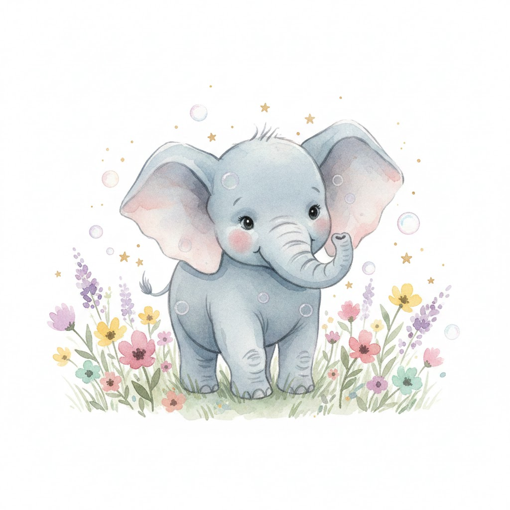 "Cute watercolor illustration of a [baby elephant] in a [field of wildflowers]. Soft pastel colors, gentle brushstrokes, with small golden stars and bubbles accentuating the whimsical atmosphere. White background."