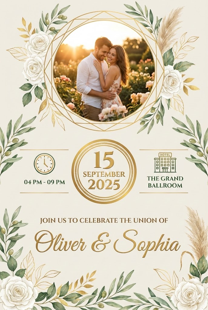 The full-bleed edge-to-edge digital graphic illustration. No borders, no margins, no external background. An elegant and luxurious invitation card in a digital graphic illustration style, featuring a pale beige background with sophisticated green and gold botanical elements, including white roses, leaves, and pampas grass. At the top, a circular frame enclosed in gold geometric lines holds a photo of a joyful couple embracing in a garden at sunset. Below the photo, three distinct sections display information: a clock icon with the time 04 PM - 09 PM on the left, a large central circular badge with gold text indicating the date 15 SEPTEMBER 2025, and a hotel icon with the location THE GRAND BALLROOM on the right. The lower half features the main text: a smaller subtitle or invitation text JOIN US TO CELEBRATE THE UNION OF followed by the main title in a large, flowing script font Oliver & Sophia. The overall impression is romantic, sophisticated, and warm. --aspect 2:3