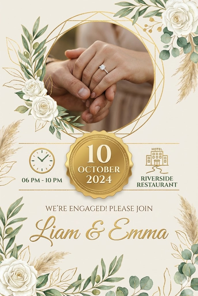 The full-bleed edge-to-edge digital graphic illustration. No borders, no margins, no external background. An elegant and luxurious invitation card in a digital graphic illustration style, featuring a pale beige background with sophisticated green and gold botanical elements, including white roses, leaves, and pampas grass. At the top, a circular frame enclosed in gold geometric lines holds a photo of a close-up of two hands holding with an engagement ring. Below the photo, three distinct sections display information: a clock icon with the time 06 PM - 10 PM on the left, a large central circular badge with gold text indicating the date 10 OCTOBER 2024, and a hotel icon with the location RIVERSIDE RESTAURANT on the right. The lower half features the main text: a smaller subtitle or invitation text WE'RE ENGAGED! PLEASE JOIN followed by the main title in a large, flowing script font Liam & Emma. The overall impression is romantic, sophisticated, and warm. --aspect 2:3