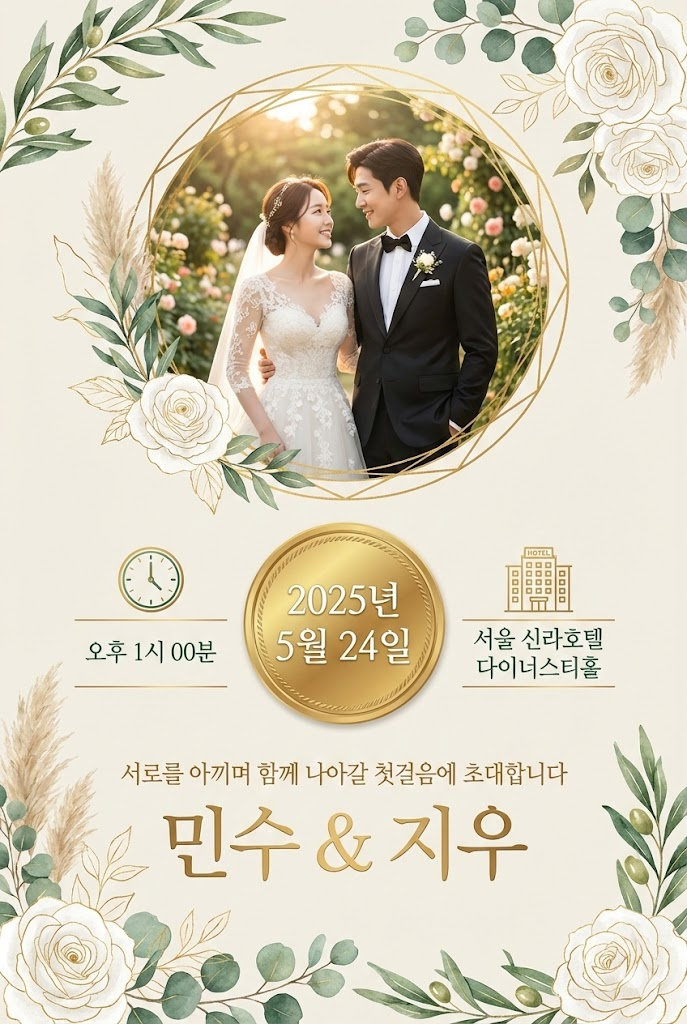 - [photo of the couple or subject]: 초대장 상단 원형 프레임에 들어갈 커플 사진 [업로드 사진]이나 주제 이미지를 묘사하세요.