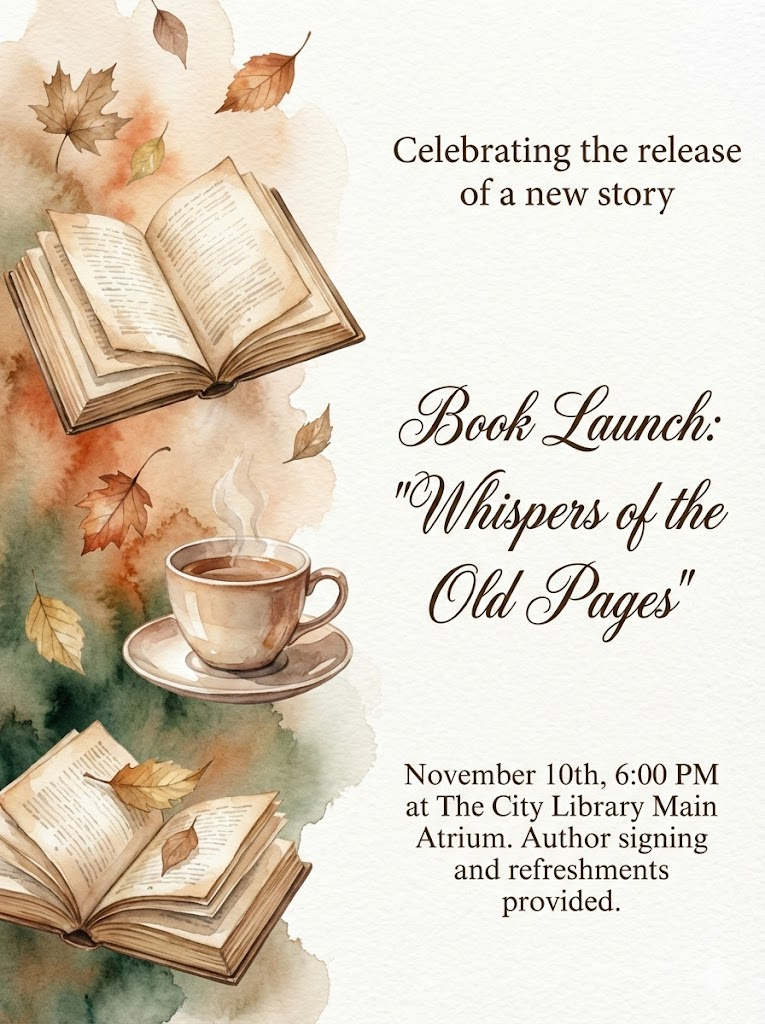 A direct, flat view of the card design itself, full-bleed edge-to-edge digital graphic card illustration. No borders, no margins, no external background. An elegant, minimalist watercolor universal invitation card design suitable for various events. On the left side, there are delicate hand-painted illustrations of open vintage books, falling autumn leaves, and a steaming cup of tea. The background features a gentle, artistic warm sepia, burnt orange, and deep forest green watercolor wash that fades into a clean white paper texture. On the opposite side of the artistic elements, professional and sophisticated typography is neatly arranged: a welcoming phrase like "Celebrating the release of a new story" is at the top, followed by the main event title "Book Launch: "Whispers of the Old Pages"" in a beautiful, flowing cursive script or elegant serif, and the event details "November 10th, 6:00 PM at The City Library Main Atrium. Author signing and refreshments provided." in a clean, legible serif font. The overall mood is romantic, airy, and sophisticated. Aspect Ratio: 3:4.