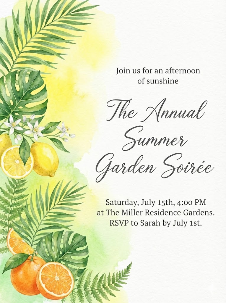 A direct, flat view of the card design itself, full-bleed edge-to-edge digital graphic card illustration. No borders, no margins, no external background. An elegant, minimalist watercolor universal invitation card design suitable for various events. On the left side, there are delicate hand-painted lush green tropical leaves, citrus fruits like lemons and oranges, and small white blossoms. The background features a gentle, artistic bright sunny yellow and fresh lime green watercolor wash that fades into a clean white paper texture. On the opposite side of the artistic elements, professional and sophisticated typography is neatly arranged: a welcoming phrase like "Join us for an afternoon of sunshine" is at the top, followed by the main event title "The Annual Summer Garden Soirée" in a beautiful, flowing cursive script or elegant serif, and the event details "Saturday, July 15th, 4:00 PM at The Miller Residence Gardens. RSVP to Sarah by July 1st." in a clean, legible serif font. The overall mood is romantic, airy, and sophisticated. Aspect Ratio: 3:4.