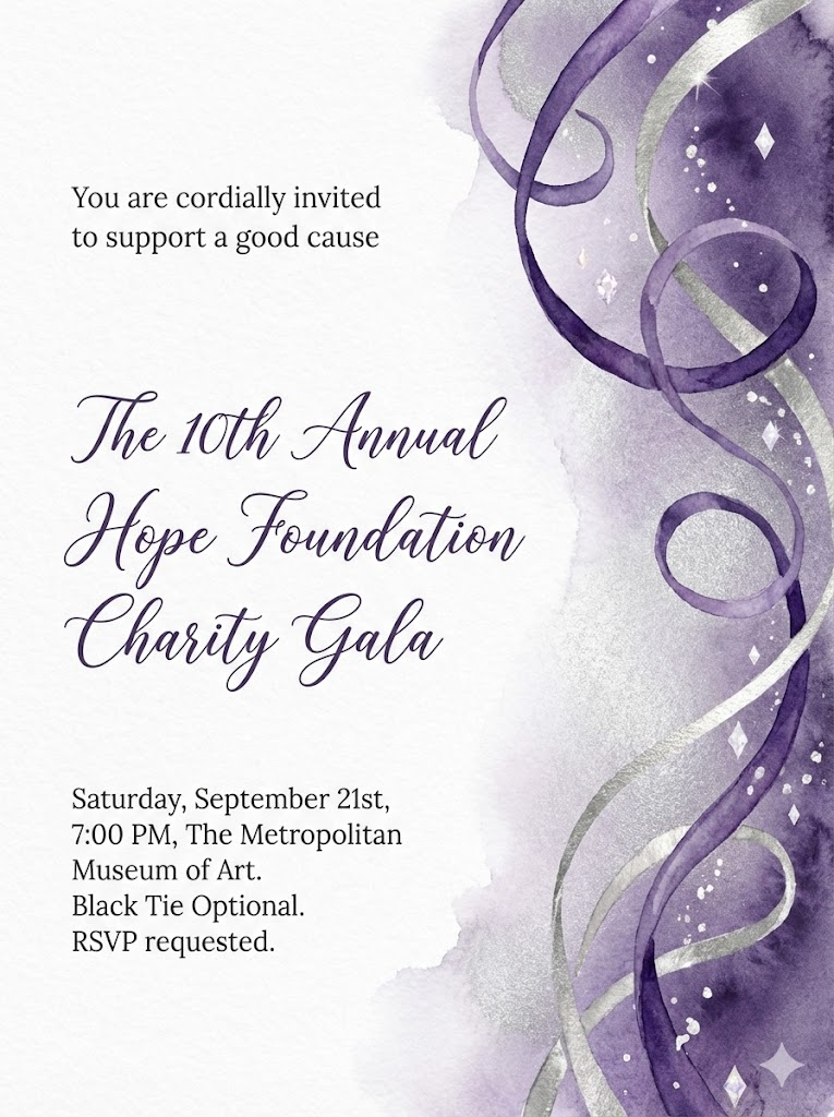 A direct, flat view of the card design itself, full-bleed edge-to-edge digital graphic card illustration. No borders, no margins, no external background. An elegant, minimalist watercolor universal invitation card design suitable for various events. On the right side, there are delicate hand-painted elegant flowing ribbons and subtle diamond sparkles rendered in watercolor. The background features a gentle, artistic deep violet and shimmering silver watercolor wash that fades into a clean white paper texture. On the opposite side of the artistic elements, professional and sophisticated typography is neatly arranged: a welcoming phrase like "You are cordially invited to support a good cause" is at the top, followed by the main event title "The 10th Annual Hope Foundation Charity Gala" in a beautiful, flowing cursive script or elegant serif, and the event details "Saturday, September 21st, 7:00 PM, The Metropolitan Museum of Art. Black Tie Optional. RSVP requested." in a clean, legible serif font. The overall mood is romantic, airy, and sophisticated. Aspect Ratio: 3:4.