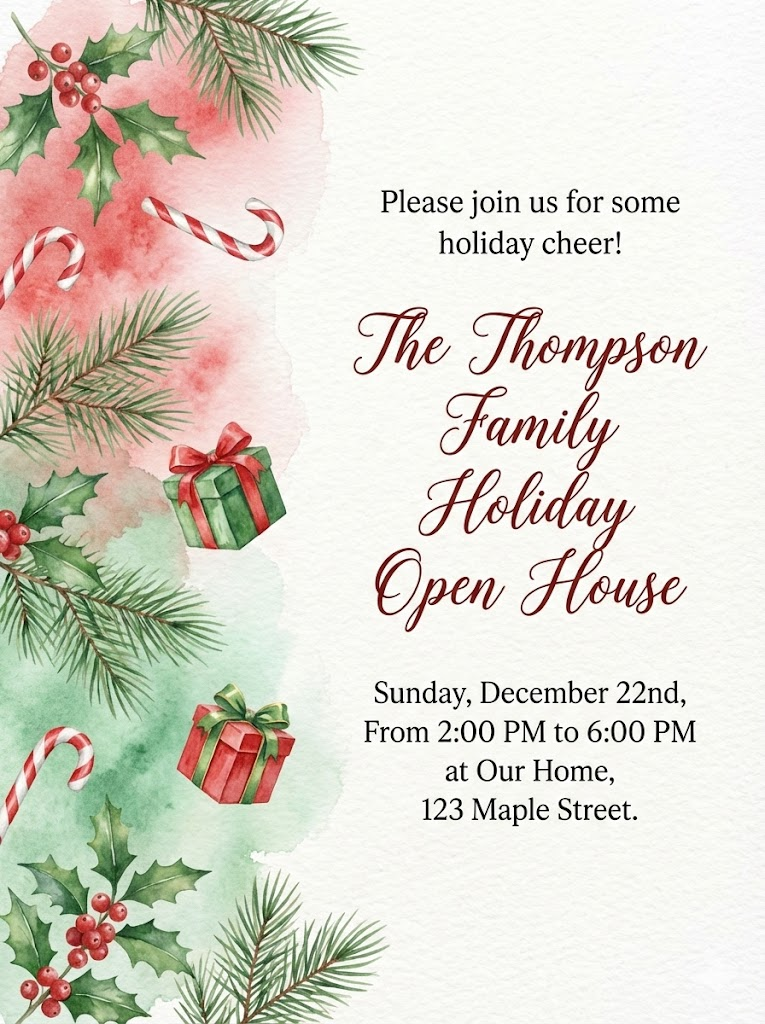 A direct, flat view of the card design itself, full-bleed edge-to-edge digital graphic card illustration. No borders, no margins, no external background. An elegant, minimalist watercolor universal invitation card design suitable for various events. On the left side, there are delicate hand-painted festive elements including holly berries, pine branches, candy canes, and small gift boxes. The background features a gentle, artistic classic Christmas red and emerald green watercolor wash that fades into a clean white paper texture. On the opposite side of the artistic elements, professional and sophisticated typography is neatly arranged: a welcoming phrase like "Please join us for some holiday cheer!" is at the top, followed by the main event title "The Thompson Family Holiday Open House" in a beautiful, flowing cursive script or elegant serif, and the event details "Sunday, December 22nd, From 2:00 PM to 6:00 PM at Our Home, 123 Maple Street." in a clean, legible serif font. The overall mood is romantic, airy, and sophisticated. Aspect Ratio: 3:4.