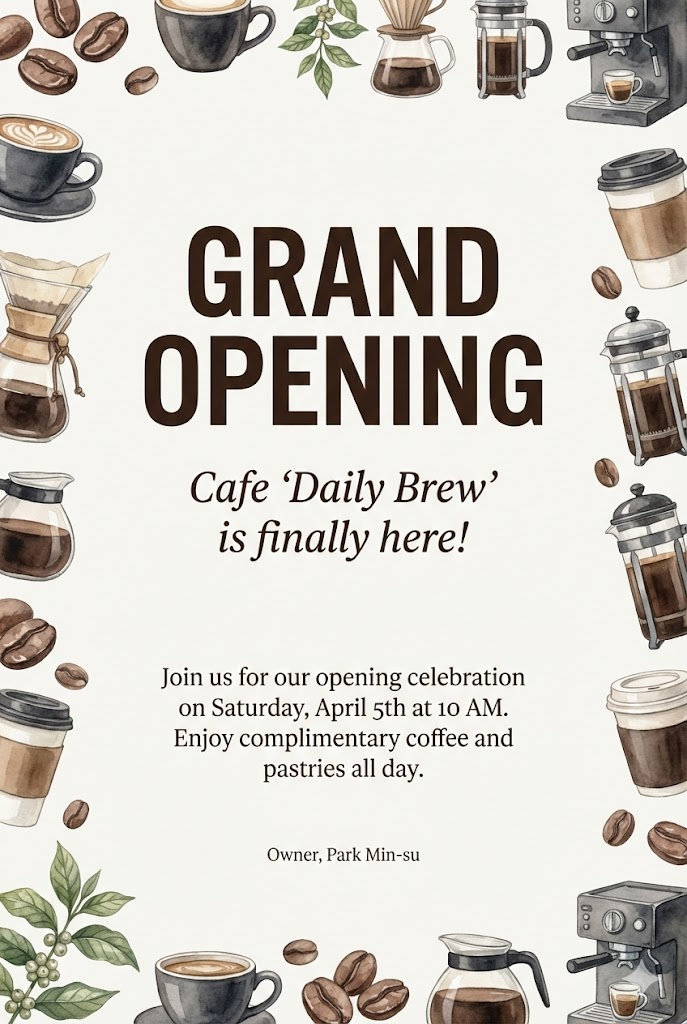 The image must be a direct, flat view of the card design itself, full-bleed edge-to-edge digital graphic card illustration. No borders, no margins, no external background. A vertical 2:3 aspect ratio decorative card template design. The card features a clean, minimalist off-white background. The entire frame is elegantly bordered with beautiful, intricate illustrations of [modern coffee beans, cups, various brewing equipment, and green plants] in a soft, artistic watercolor style. In the center of the card, there is a structured text layout with varying font sizes: a very large and bold title " GRAND OPENING" at the top center, followed by a medium-sized subtitle " Cafe 'Daily Brew' is finally here! " below it. In the lower middle section, there is a small-sized body text " Join us for our opening celebration on Saturday, April 5th at 10 AM. Enjoy complimentary coffee and pastries all day. ", and at the very bottom, a tiny font for the sender " Owner, Park Min-su". The overall aesthetic is professional, sophisticated, and clean. --ar 2:3