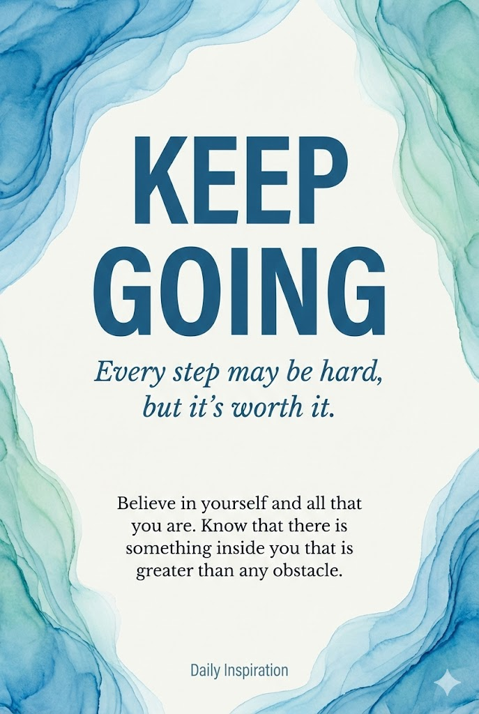 The image must be a direct, flat view of the card design itself, full-bleed edge-to-edge digital graphic card illustration. No borders, no margins, no external background. A vertical 2:3 aspect ratio decorative card template design. The card features a clean, minimalist off-white background. The entire frame is elegantly bordered with beautiful, intricate illustrations of [abstract flowing watercolor washes in calming shades of ocean blue and seafoam green] in a soft, artistic watercolor style. In the center of the card, there is a structured text layout with varying font sizes: a very large and bold title " KEEP GOING " at the top center, followed by a medium-sized subtitle " Every step may be hard, but it's worth it." below it. In the lower middle section, there is a small-sized body text " Believe in yourself and all that you are. Know that there is something inside you that is greater than any obstacle.]", and at the very bottom, a tiny font for the sender " Daily Inspiration". The overall aesthetic is professional, sophisticated, and clean. --ar 2:3