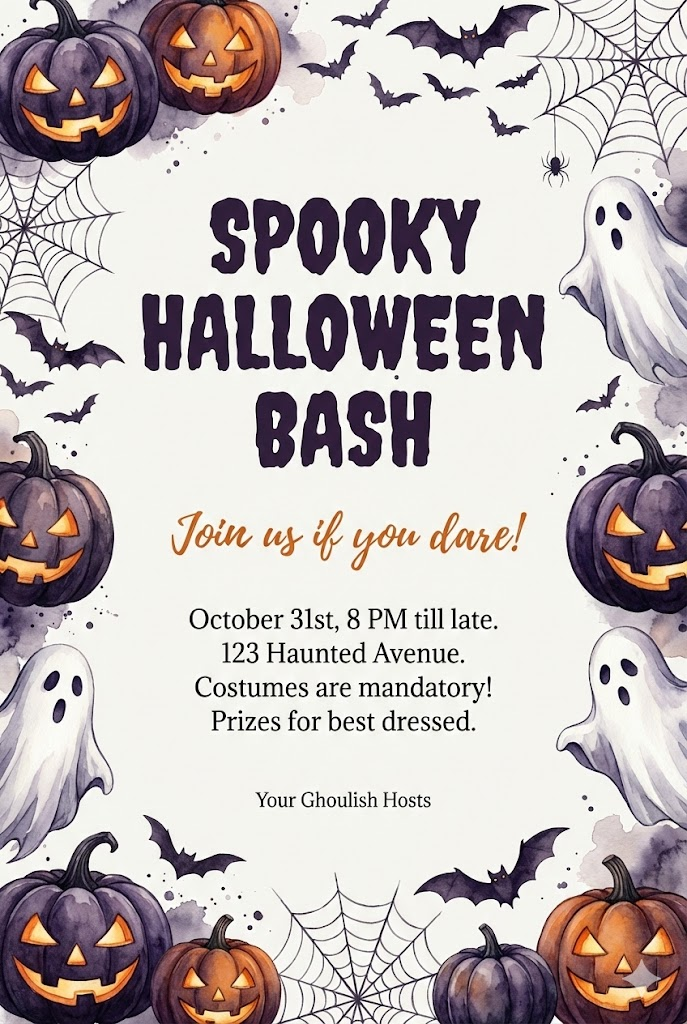 The image must be a direct, flat view of the card design itself, full-bleed edge-to-edge digital graphic card illustration. No borders, no margins, no external background. A vertical 2:3 aspect ratio decorative card template design. The card features a clean, minimalist off-white background. The entire frame is elegantly bordered with beautiful, intricate illustrations of [spooky pumpkins, ghosts, bats, and spiderwebs in dark purple, orange, and black] in a soft, artistic watercolor style. In the center of the card, there is a structured text layout with varying font sizes: a very large and bold title " SPOOKY HALLOWEEN BASH " at the top center, followed by a medium-sized subtitle " Join us if you dare!]" below it. In the lower middle section, there is a small-sized body text " October 31st, 8 PM till late. 123 Haunted Avenue. Costumes are mandatory! Prizes for best dressed.", and at the very bottom, a tiny font for the sender " Your Ghoulish Hosts". The overall aesthetic is professional, sophisticated, and clean. --ar 2:3