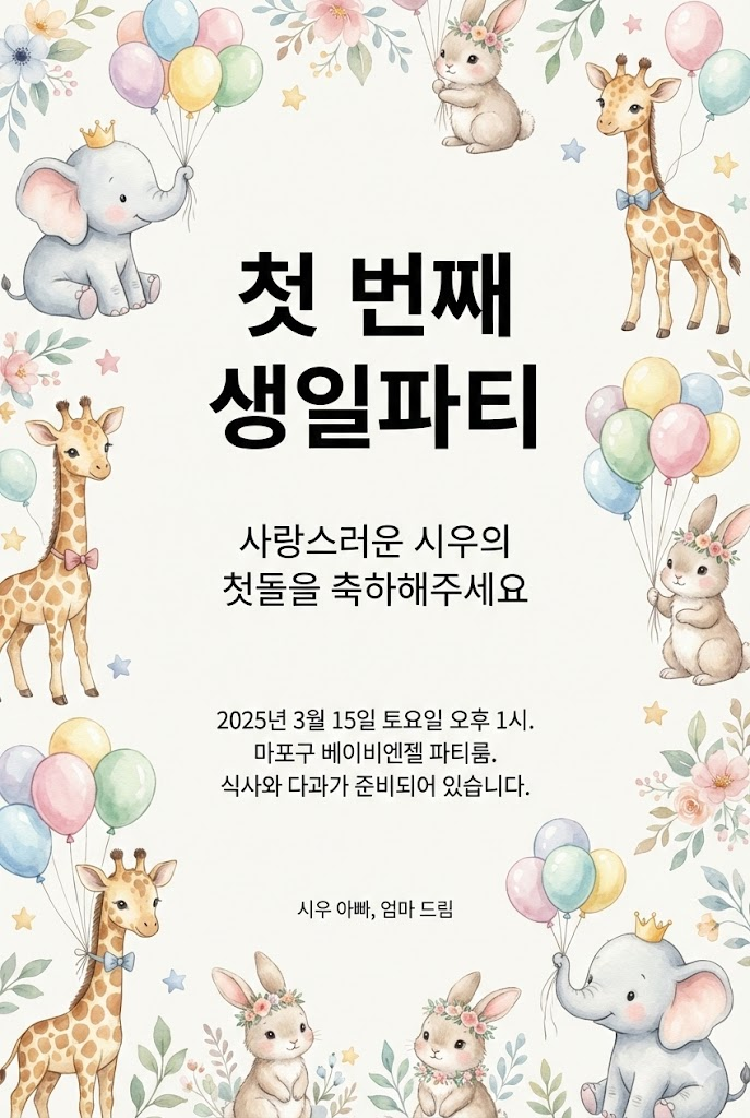 The image must be a direct, flat view of the card design itself, full-bleed edge-to-edge digital graphic card illustration. No borders, no margins, no external background. A vertical 2:3 aspect ratio decorative card template design. The card features a clean, minimalist off-white background. The entire frame is elegantly bordered with beautiful, intricate illustrations of [cute pastel baby animals like elephants, giraffes, and rabbits with balloons] in a soft, artistic watercolor style. In the center of the card, there is a structured text layout with varying font sizes: a very large and bold title " 첫 번째 생일파티" at the top center, followed by a medium-sized subtitle "사랑스러운 시우의 첫돌을 축하해주세요" below it. In the lower middle section, there is a small-sized body text "2025년 3월 15일 토요일 오후 1시. 마포구 베이비엔젤 파티룸. 식사와 다과가 준비되어 있습니다.", and at the very bottom, a tiny font for the sender "시우 아빠, 엄마 드림". The overall aesthetic is professional, sophisticated, and clean. --ar 2:3