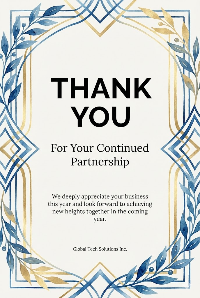 The image must be a direct, flat view of the card design itself, full-bleed edge-to-edge digital graphic card illustration. No borders, no margins, no external background. A vertical 2:3 aspect ratio decorative card template design. The card features a clean, minimalist off-white background. The entire frame is elegantly bordered with beautiful, intricate illustrations of [elegant blue and gold geometric watercolor patterns interwoven with laurel branches] in a soft, artistic watercolor style. In the center of the card, there is a structured text layout with varying font sizes: a very large and bold title " THANK YOU" at the top center, followed by a medium-sized subtitle " For Your Continued Partnership" below it. In the lower middle section, there is a small-sized body text " We deeply appreciate your business this year and look forward to achieving new heights together in the coming year. ", and at the very bottom, a tiny font for the sender " Global Tech Solutions Inc.". The overall aesthetic is professional, sophisticated, and clean. --ar 2:3