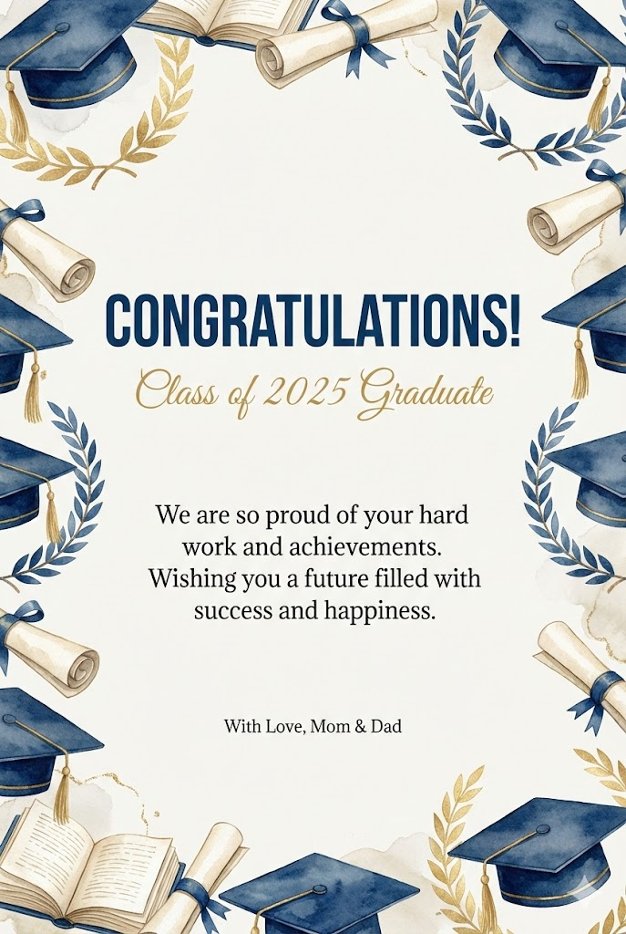 The image must be a direct, flat view of the card design itself, full-bleed edge-to-edge digital graphic card illustration. No borders, no margins, no external background. A vertical 2:3 aspect ratio decorative card template design. The card features a clean, minimalist off-white background. The entire frame is elegantly bordered with beautiful, intricate illustrations of [graduation caps, rolled diplomas, open books, and laurel wreaths in deep blue and gold] in a soft, artistic watercolor style. In the center of the card, there is a structured text layout with varying font sizes: a very large and bold title " CONGRATULATIONS! " at the top center, followed by a medium-sized subtitle " Class of 2025 Graduate" below it. In the lower middle section, there is a small-sized body text " We are so proud of your hard work and achievements. Wishing you a future filled with success and happiness.]", and at the very bottom, a tiny font for the sender " With Love, Mom & Dad]". The overall aesthetic is professional, sophisticated, and clean. --ar 2:3