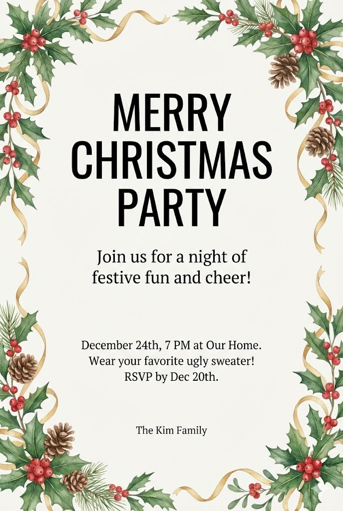 The image must be a direct, flat view of the card design itself, full-bleed edge-to-edge digital graphic card illustration. No borders, no margins, no external background. A vertical 2:3 aspect ratio decorative card template design. The card features a clean, minimalist off-white background. The entire frame is elegantly bordered with beautiful, intricate illustrations of [festive holly branches, red berries, pinecones, and gold ribbons] in a soft, artistic watercolor style. In the center of the card, there is a structured text layout with varying font sizes: a very large and bold title " MERRY CHRISTMAS PARTY" at the top center, followed by a medium-sized subtitle "Join us for a night of festive fun and cheer!" below it. In the lower middle section, there is a small-sized body text " December 24th, 7 PM at Our Home. Wear your favorite ugly sweater! RSVP by Dec 20th. ", and at the very bottom, a tiny font for the sender " The Kim Family". The overall aesthetic is professional, sophisticated, and clean. --ar 2:3
