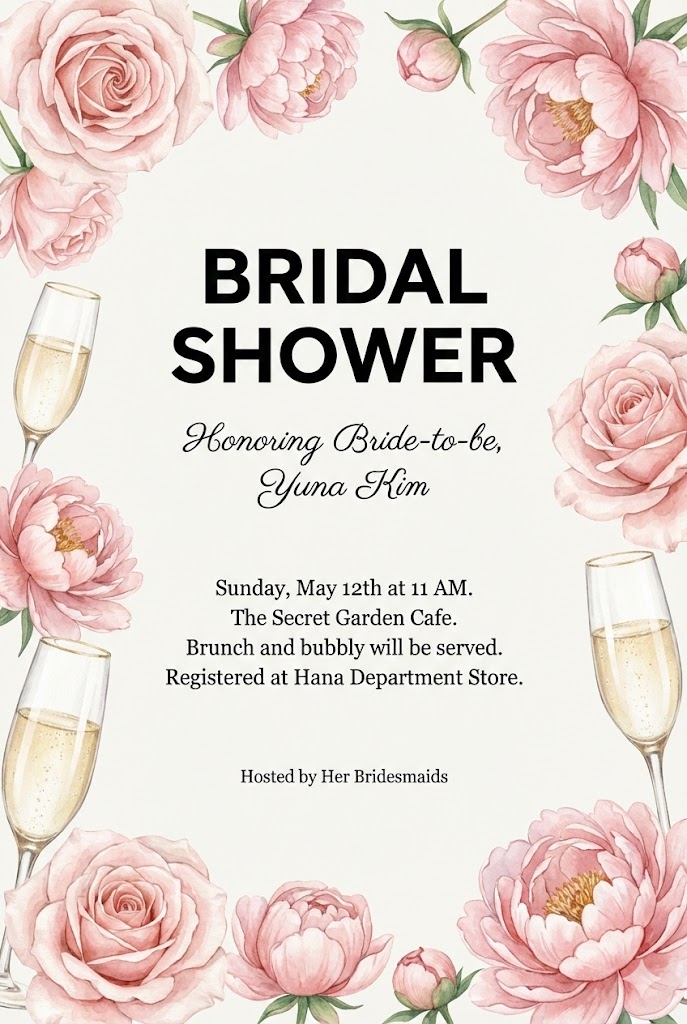 The image must be a direct, flat view of the card design itself, full-bleed edge-to-edge digital graphic card illustration. No borders, no margins, no external background. A vertical 2:3 aspect ratio decorative card template design. The card features a clean, minimalist off-white background. The entire frame is elegantly bordered with beautiful, intricate illustrations of [blush pink roses, peonies, and delicate champagne glasses] in a soft, artistic watercolor style. In the center of the card, there is a structured text layout with varying font sizes: a very large and bold title " BRIDAL SHOWER" at the top center, followed by a medium-sized subtitle " Honoring Bride-to-be, Yuna Kim" below it. In the lower middle section, there is a small-sized body text " Sunday, May 12th at 11 AM. The Secret Garden Cafe. Brunch and bubbly will be served. Registered at Hana Department Store.", and at the very bottom, a tiny font for the sender " Hosted by Her Bridesmaids ". The overall aesthetic is professional, sophisticated, and clean. --ar 2:3