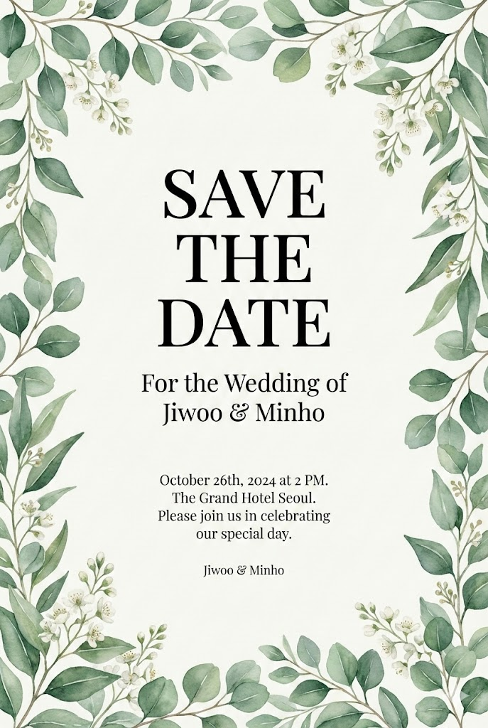 he image must be a direct, flat view of the card design itself, full-bleed edge-to-edge digital graphic card illustration. No borders, no margins, no external background. A vertical 2:3 aspect ratio decorative card template design. The card features a clean, minimalist off-white background. The entire frame is elegantly bordered with beautiful, intricate illustrations of [lush green eucalyptus leaves and small white flowers] in a soft, artistic watercolor style. In the center of the card, there is a structured text layout with varying font sizes: a very large and bold title " SAVE THE DATE" at the top center, followed by a medium-sized subtitle "For the Wedding of Jiwoo & Minho" below it. In the lower middle section, there is a small-sized body text " October 26th, 2024 at 2 PM. The Grand Hotel Seoul. Please join us in celebrating our special day.", and at the very bottom, a tiny font for the sender " Jiwoo & Minho". The overall aesthetic is professional, sophisticated, and clean. --ar 2:3