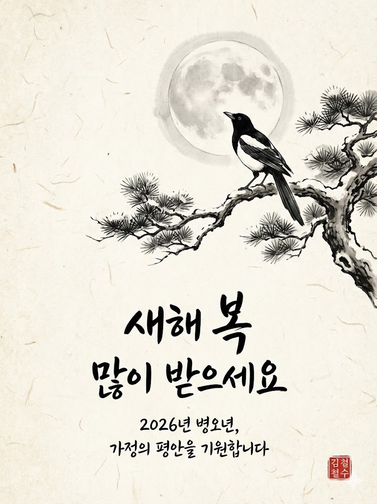 단 한 번의 생성으로 **그림, 텍스트, 그리고 낙관(서명)**까지 완벽하게 배치된 예술적인 연하장을 만들어보세요