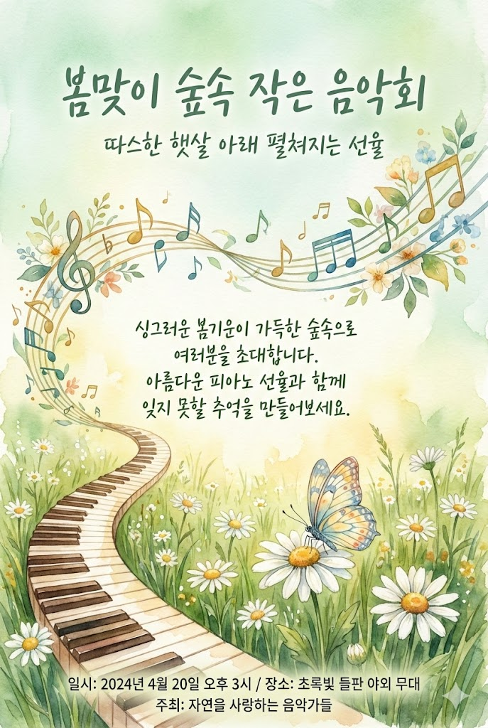 🌿 싱그러운 자연 속 음악회 초대장 만들기: 수채화 스타일 포스터 프롬프트