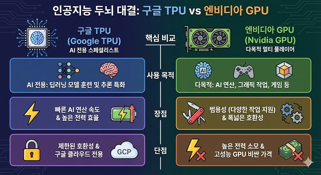 | 구분 | 구글 TPU (Google TPU) 🚀 | 엔비디아 GPU (Nvidia GPU) 🛠️ |