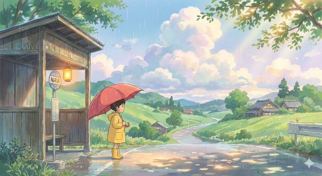 Create a breathtaking Studio Ghibli style illustration featuring a boy holding a red umbrella, looking down the road expectantly. The scene is set in a rural bus stop in the rain, with wet pavement reflecting the lights. The art style mimics the hand-painted magic of Hayao Miyazaki, characterized by soft pastel color palettes, lush greenery, and a dreamy, nostalgic atmosphere. Include details like komorebi (sunlight filtering through leaves), fluffy cumulus clouds, and gentle, whimsical textures. Ensure the lighting is warm and glowing, evoking a sense of cozy wonder and emotional depth. High resolution, anime movie screenshot aesthetic.