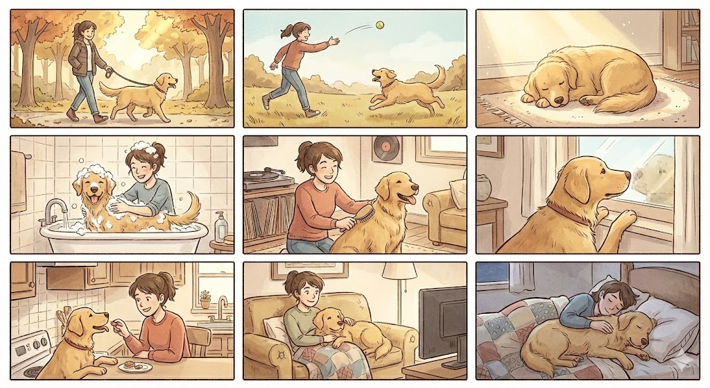 A 9-panel comic strip illustration in a hand-drawn, warm, and gentle style, similar to image_0.png. Each panel captures a different slice of life moment featuring a cheerful woman and her golden retriever dog. The scenes include morning walk in the park, playing fetch with a ball, the dog sleeping in a sunbeam, giving the dog a bath, brushing the dog's fur, the dog looking out the window, sharing a snack, cuddling on the sofa, sleeping together in bed. The colors are soft and muted, with visible textured lines and a cozy, nostalgic atmosphere.