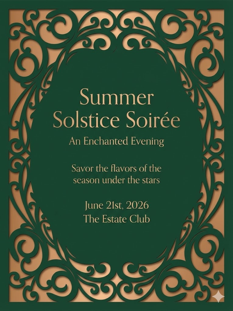 A direct, flat view of the card design itself, occupying the entire frame with no external background, margins, or borders visible. This is a full-bleed edge-to-edge digital graphic card illustration where the card surface is the only visible element. Layer 1 (Base): A solid Metallic Bronze foundation layer. Layer 2 (Middle): A Deep Forest Green full-surface overlay sheet that completely covers the base and fills the entire canvas from edge to edge, featuring an intricate, elegant die-cut carved frame with ornate scrollwork and cutout details. The base color is revealed ONLY through the delicate negative spaces of the cutouts, creating a realistic depth effect with subtle soft shadows. Layer 3 (Typography): Refined and centered typography featuring a large main title "Summer Solstice Soirée", a smaller subtitle "An Enchanted Evening", meaningful body text "Savor the flavors of the season under the stars", a specific date "June 21st, 2026", and the names of the The Estate Club. The typography must be written on Layer 2 paper. The overall aesthetic is clean, luxurious, and modern, mimicking a premium laser-cut paper card. Ratio: 3:4