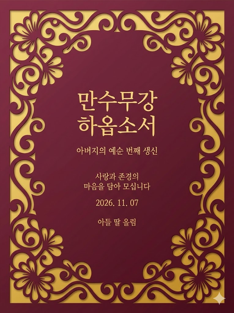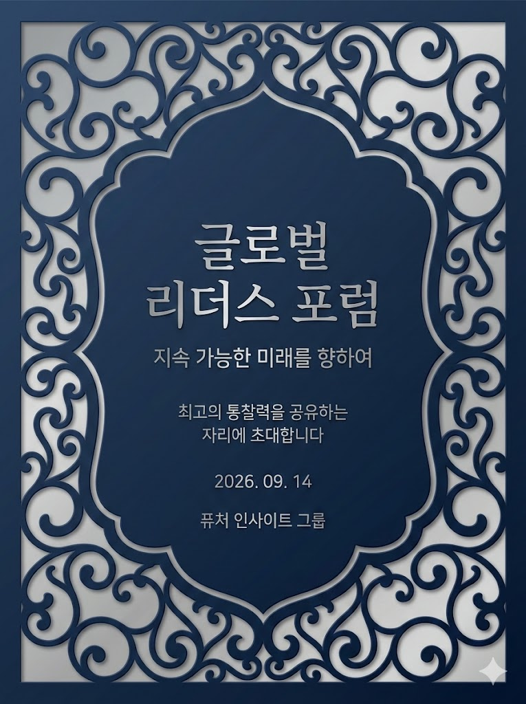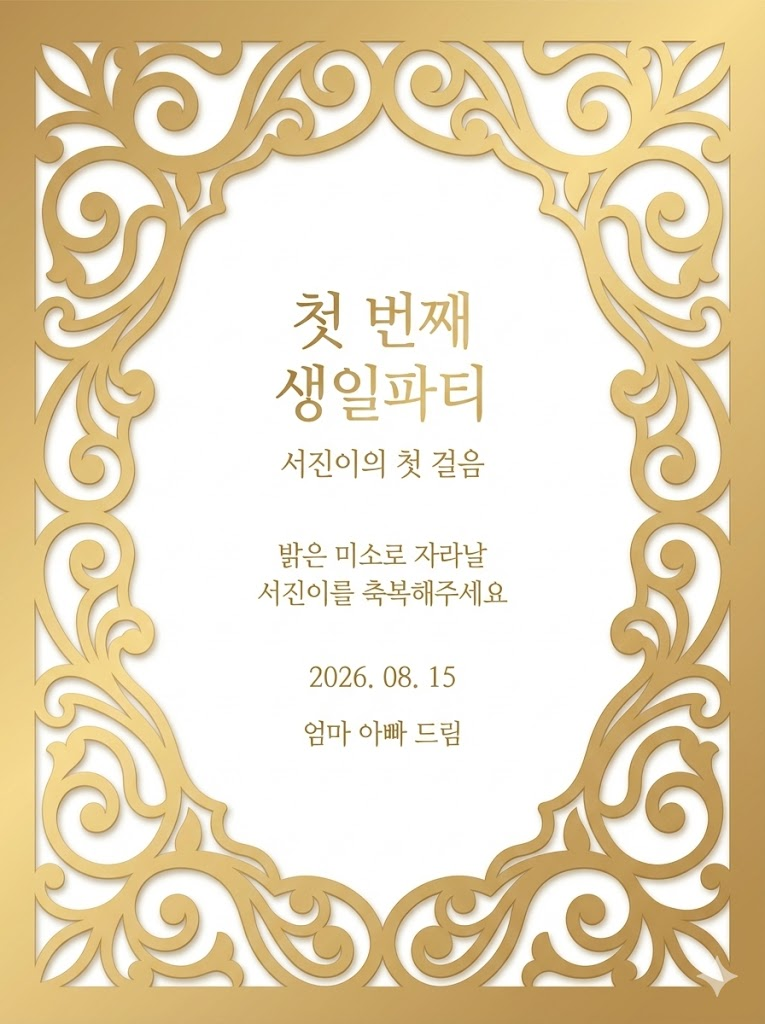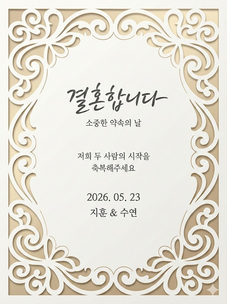 모서리의 일러스트 장식을 과감히 제거하고, 오직 정교한 레이저 컷팅 패턴과 타이포그래피에만 집중한 미니멀 럭셔리 디자인 프롬프트를 제작했습니다. 일러스트가 빠진 자리는 더욱 섬세해진 컷팅 문양과 폰트의 아름다움이 채우게 됩니다. 불필요한 장식 요소를 덜어냄으로써 오히려 정보의 가독성이 높아지고, 종이 본연의 질감과 색상 대비가 주는 고급스러움이 극대화됩니다. 격식 있는 비즈니스 초대장이나 아주 심플한 웨딩 카드를 원하는 분들에게 최고의 선택이 될 것입니다.