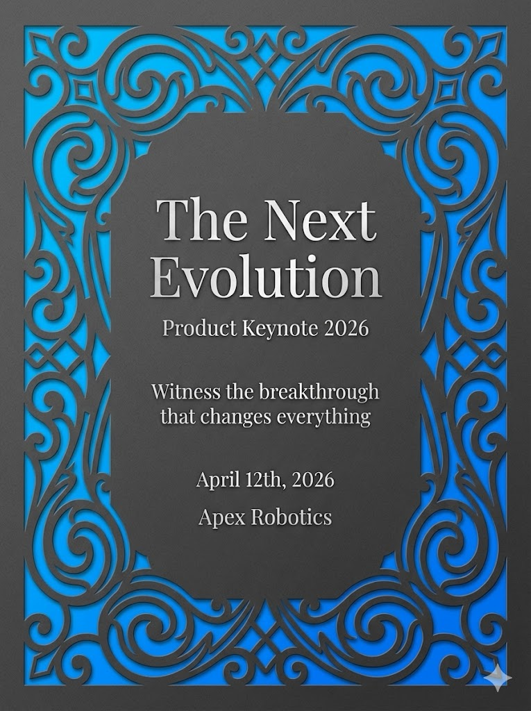 A direct, flat view of the card design itself, occupying the entire frame with no external background, margins, or borders visible. This is a full-bleed edge-to-edge digital graphic card illustration where the card surface is the only visible element. Layer 1 (Base): A solid Neon Electric Blue foundation layer. Layer 2 (Middle): A Textured Charcoal Gray full-surface overlay sheet that completely covers the base and fills the entire canvas from edge to edge, featuring an intricate, elegant die-cut carved frame with ornate scrollwork and cutout details. The base color is revealed ONLY through the delicate negative spaces of the cutouts, creating a realistic depth effect with subtle soft shadows. Layer 3 (Typography): Refined and centered typography featuring a large main title "The Next Evolution", a smaller subtitle "Product Keynote 2026", meaningful body text "Witness the breakthrough that changes everything", a specific date "April 12th, 2026", and the names of the Apex Robotics. The overall aesthetic is clean, luxurious, and modern, mimicking a premium laser-cut paper card. Ratio: 3:4