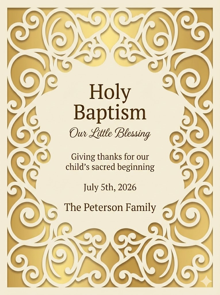 A direct, flat view of the card design itself, occupying the entire frame with no external background, margins, or borders visible. This is a full-bleed edge-to-edge digital graphic card illustration where the card surface is the only visible element. Layer 1 (Base): A solid Yellow Gold foundation layer. Layer 2 (Middle): A Smooth Creamy White full-surface overlay sheet that completely covers the base and fills the entire canvas from edge to edge, featuring an intricate, elegant die-cut carved frame with ornate scrollwork and cutout details. The base color is revealed ONLY through the delicate negative spaces of the cutouts, creating a realistic depth effect with subtle soft shadows. Layer 3 (Typography): Refined and centered typography featuring a large main title "Holy Baptism", a smaller subtitle "Our Little Blessing", meaningful body text "Giving thanks for our child's sacred beginning", a specific date "July 5th, 2026", and the names of the The Peterson Family. The typography must be written on Layer 2 paper. The overall aesthetic is clean, luxurious, and modern, mimicking a premium laser-cut paper card. Ratio: 3:4