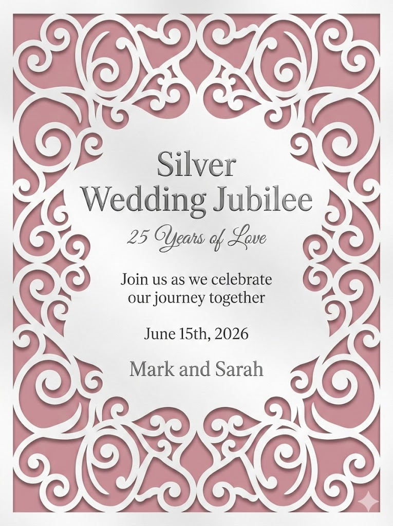 A direct, flat view of the card design itself, occupying the entire frame with no external background, margins, or borders visible. This is a full-bleed edge-to-edge digital graphic card illustration where the card surface is the only visible element. Layer 1 (Base): A solid Dusty Rose Pink foundation layer. Layer 2 (Middle): A Silk Textured White  full-surface overlay sheet that completely covers the base and fills the entire canvas from edge to edge, featuring an intricate, elegant die-cut carved frame with ornate scrollwork and cutout details. The base color is revealed ONLY through the delicate negative spaces of the cutouts, creating a realistic depth effect with subtle soft shadows. Layer 3 (Typography): Refined and centered typography featuring a large main title "Silver Wedding Jubilee", a smaller subtitle "25 Years of Love", meaningful body text "Join us as we celebrate our journey together", a specific date "June 15th, 2026", and the names of the Mark and Sarah. The typography must be written on Layer 2 paper. The overall aesthetic is clean, luxurious, and modern, mimicking a premium laser-cut paper card. Ratio: 3:4