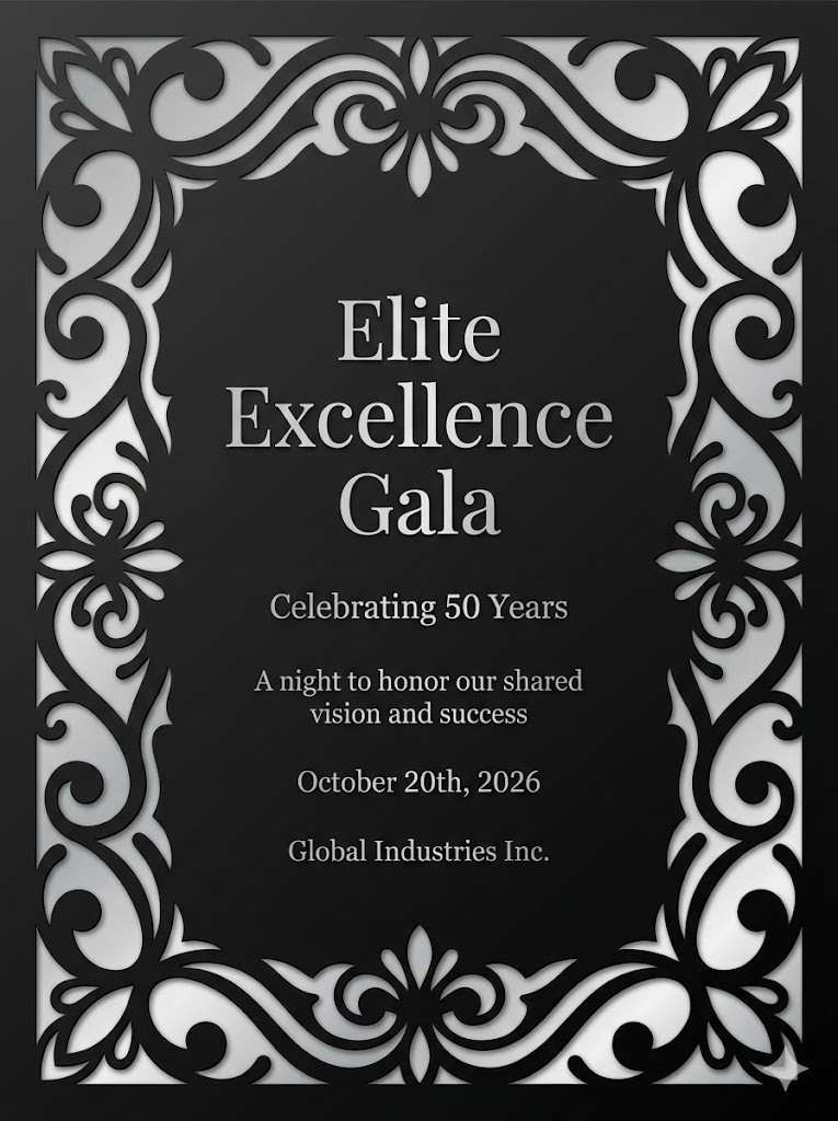 A direct, flat view of the card design itself, occupying the entire frame with no external background, margins, or borders visible. This is a full-bleed edge-to-edge digital graphic card illustration where the card surface is the only visible element. Layer 1 (Base): A solid Shining Platinum Silver foundation layer. Layer 2 (Middle): A Matte Obsidian Black full-surface overlay sheet that completely covers the base and fills the entire canvas from edge to edge, featuring an intricate, elegant die-cut carved frame with ornate scrollwork and cutout details. The base color is revealed ONLY through the delicate negative spaces of the cutouts, creating a realistic depth effect with subtle soft shadows. Layer 3 (Typography): Refined and centered typography featuring a large main title "Elite Excellence Gala", a smaller subtitle "Celebrating 50 Years", meaningful body text "A night to honor our shared vision and success", a specific date "October 20th, 2026", and the names of the Global Industries Inc. The typography must be written on Layer 2 paper. The overall aesthetic is clean, luxurious, and modern, mimicking a premium laser-cut paper card. Ratio: 3:4