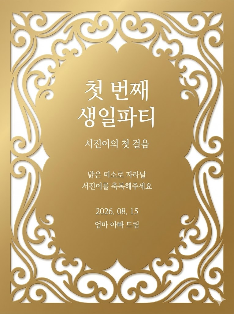 모서리의 일러스트 장식을 과감히 제거하고, 오직 정교한 레이저 컷팅 패턴과 타이포그래피에만 집중한 미니멀 럭셔리 디자인 프롬프트를 제작했습니다. 일러스트가 빠진 자리는 더욱 섬세해진 컷팅 문양과 폰트의 아름다움이 채우게 됩니다. 불필요한 장식 요소를 덜어냄으로써 오히려 정보의 가독성이 높아지고, 종이 본연의 질감과 색상 대비가 주는 고급스러움이 극대화됩니다. 격식 있는 비즈니스 초대장이나 아주 심플한 웨딩 카드를 원하는 분들에게 최고의 선택이 될 것입니다.