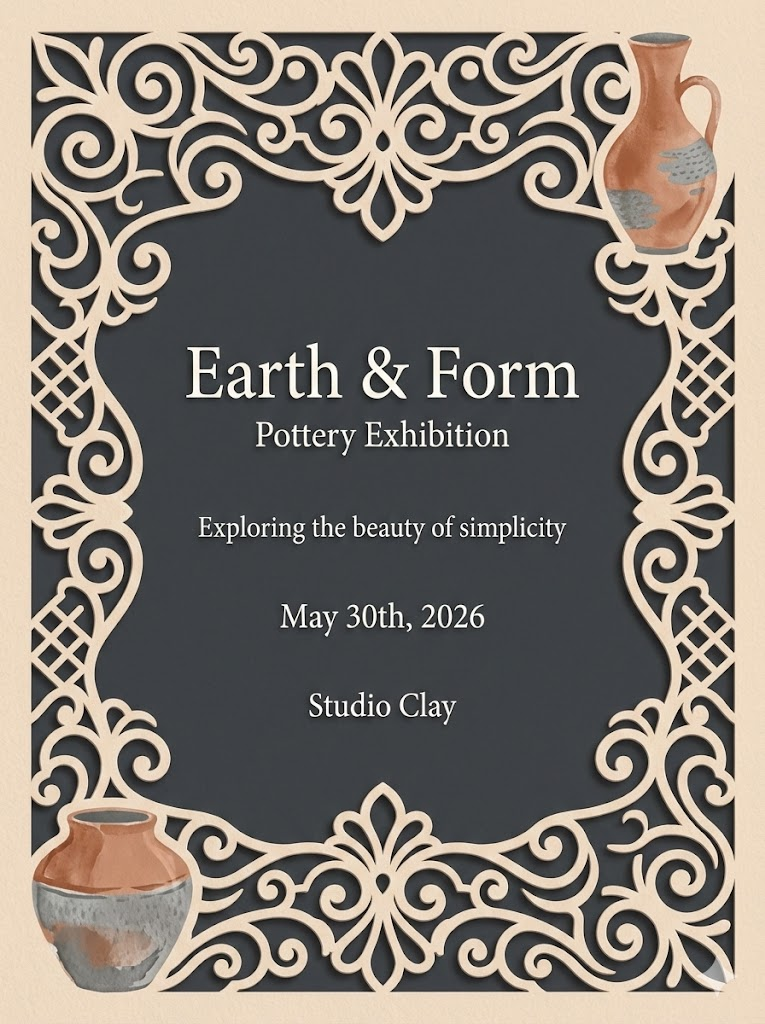 A direct, flat view of the card design itself, occupying the entire frame with no external background, margins, or borders visible. This is a full-bleed edge-to-edge digital graphic card illustration where the card surface is the only visible element. Layer 1 (Base): A solid Matte Charcoal foundation layer. Layer 2 (Middle): A Soft Desert Sand full-surface overlay sheet that completely covers the base and fills the entire canvas from edge to edge, featuring an intricate, elegant die-cut carved frame with ornate scrollwork and cutout details. The base color is revealed ONLY through the delicate negative spaces of the cutouts, creating a realistic depth effect with subtle soft shadows. Layer 3 (Illustrations): Delicate, hand-painted Minimalist Clay Pottery in a Terra Cotta and Gray, placed artistically in the top-right and bottom-left corners. Layer 4 (Typography): Refined and centered typography featuring a large main title "Earth & Form", a smaller subtitle "Pottery Exhibition", meaningful body text "Exploring the beauty of simplicity", a specific date "May 30th, 2026", and the names of the Studio Clay. The overall aesthetic is clean, luxurious, and modern, mimicking a premium laser-cut paper card. Ratio: 3:4