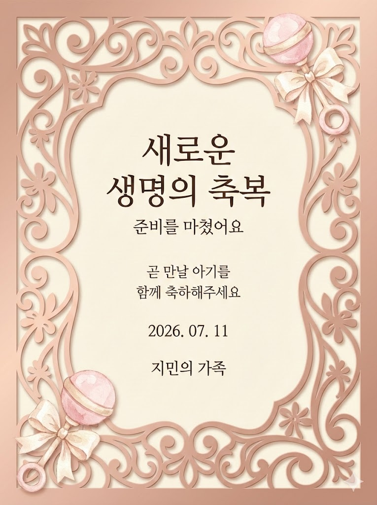 A direct, flat view of the card design itself, occupying the entire frame with no external background, margins, or borders visible. This is a full-bleed edge-to-edge digital graphic card illustration where the card surface is the only visible element. Layer 1 (Base): A solid Warm Cream foundation layer. Layer 2 (Middle): A Soft Rose Gold full-surface overlay sheet that completely covers the base and fills the entire canvas from edge to edge, featuring an intricate, elegant die-cut carved frame with ornate scrollwork and cutout details. The base color is revealed ONLY through the delicate negative spaces of the cutouts, creating a realistic depth effect with subtle soft shadows. Layer 3 (Illustrations): Delicate, hand-painted Baby Rattles and Bows in a Pink and Ivory, placed artistically in the top-right and bottom-left corners. Layer 4 (Typography): Refined and centered typography featuring a large main title "새로운 생명의 축복", a smaller subtitle "준비를 마쳤어요", meaningful body text "곧 만날 아기를 함께 축하해주세요", a specific date "2026. 07. 11", and the names of the 지민의 가족. The overall aesthetic is clean, luxurious, and modern, mimicking a premium laser-cut paper card. Ratio: 3:4