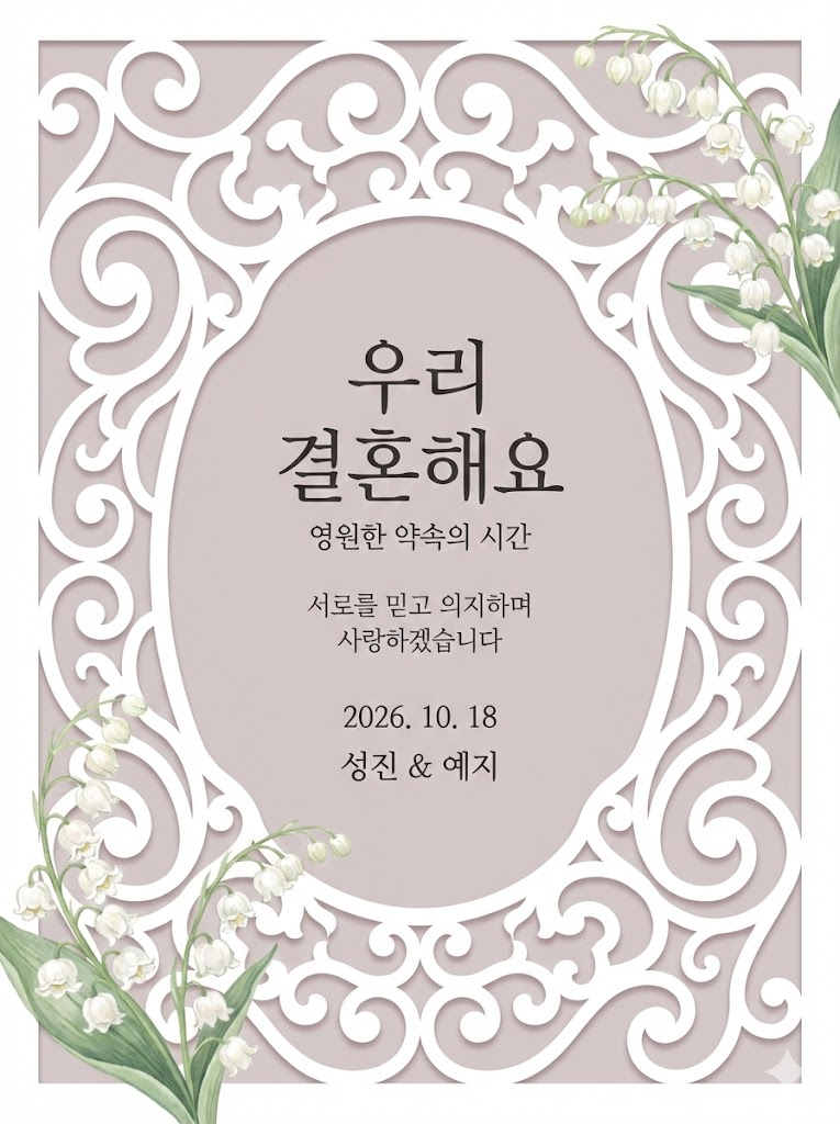 A direct, flat view of the card design itself, occupying the entire frame with no external background, margins, or borders visible. This is a full-bleed edge-to-edge digital graphic card illustration where the card surface is the only visible element. Layer 1 (Base): A solid Soft Silver Pink foundation layer. Layer 2 (Middle): A Pure Matte White full-surface overlay sheet that completely covers the base and fills the entire canvas from edge to edge, featuring an intricate, elegant die-cut carved frame with ornate scrollwork and cutout details. The base color is revealed ONLY through the delicate negative spaces of the cutouts, creating a realistic depth effect with subtle soft shadows. Layer 3 (Illustrations): Delicate, hand-painted Lily of the Valley in a Pearl and Soft Green, placed artistically in the top-right and bottom-left corners. Layer 4 (Typography): Refined and centered typography featuring a large main title "우리 결혼해요", a smaller subtitle "영원한 약속의 시간", meaningful body text "서로를 믿고 의지하며 사랑하겠습니다", a specific date "2026. 10. 18", and the names of the 성진 & 예지. The overall aesthetic is clean, luxurious, and modern, mimicking a premium laser-cut paper card. Ratio: 3:4