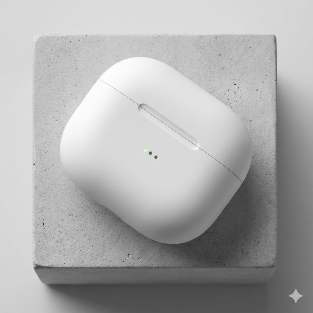 A high-resolution, studio-lit product photograph of a matte white wireless earbuds case on a minimalist light gray concrete block. The lighting is a top-down diffused lighting to minimize harsh shadows and give a clean look. The camera angle is a macro shot to showcase the seamless hinge design. Ultra-realistic, with sharp focus on the LED battery indicator. --ar 1:1