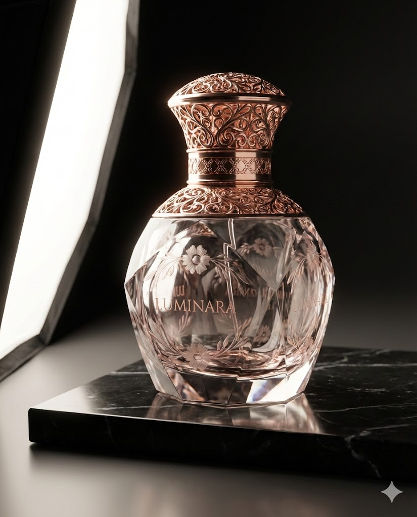 A high-resolution, studio-lit product photograph of a crystal perfume bottle with rose gold accents on a reflective black marble surface. The lighting is a side softbox lighting to create elegant gradients and depth. The camera angle is a low angle to showcase the premium height and silhouette. Ultra-realistic, with sharp focus on the delicate glass etching. --ar 4:5