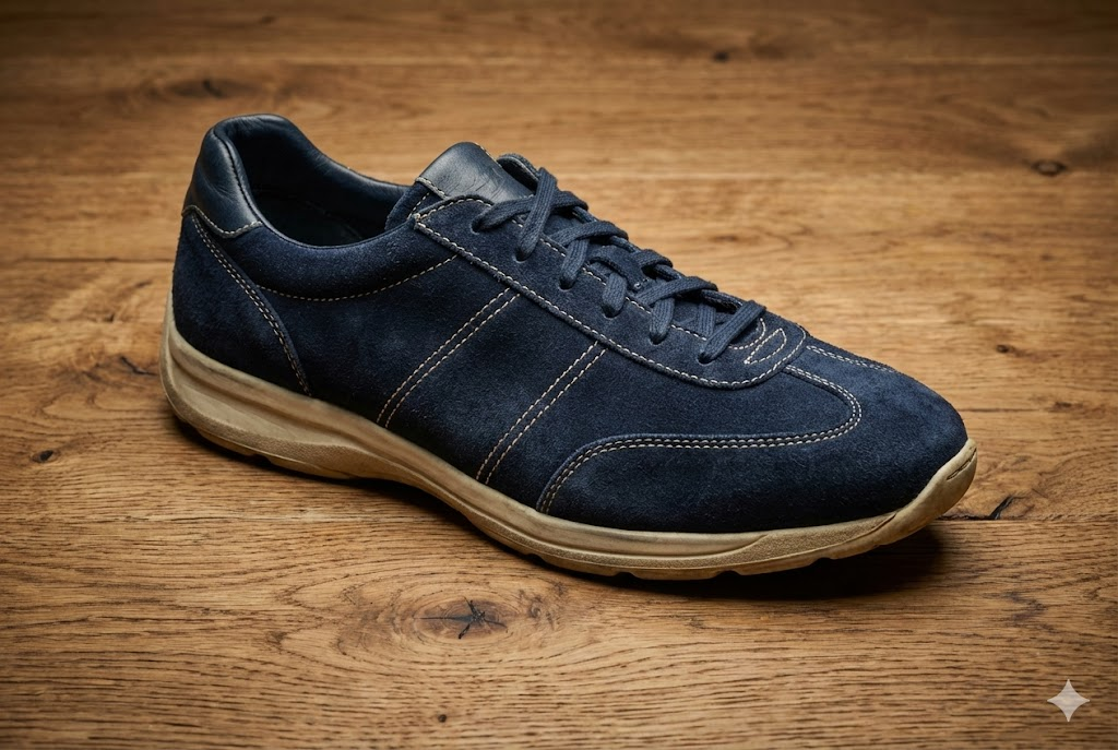 A high-resolution, studio-lit product photograph of a navy blue suede vintage sneaker on a textured oak wood floor. The lighting is a three-point softbox setup to emphasize the rich texture of the suede. The camera angle is a 45-degree side view to showcase the ergonomic sole design. Ultra-realistic, with sharp focus on the intricate stitching patterns. --ar 3:2