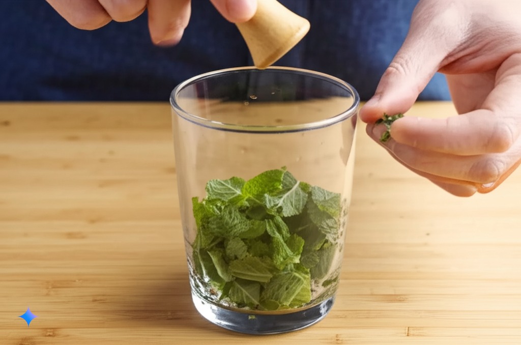 향긋한 민트의 향이 퍼지도록 가볍게 눌러주세요. 너무 세게 으깨면 쓴맛이 날 수 있어요! ✋
