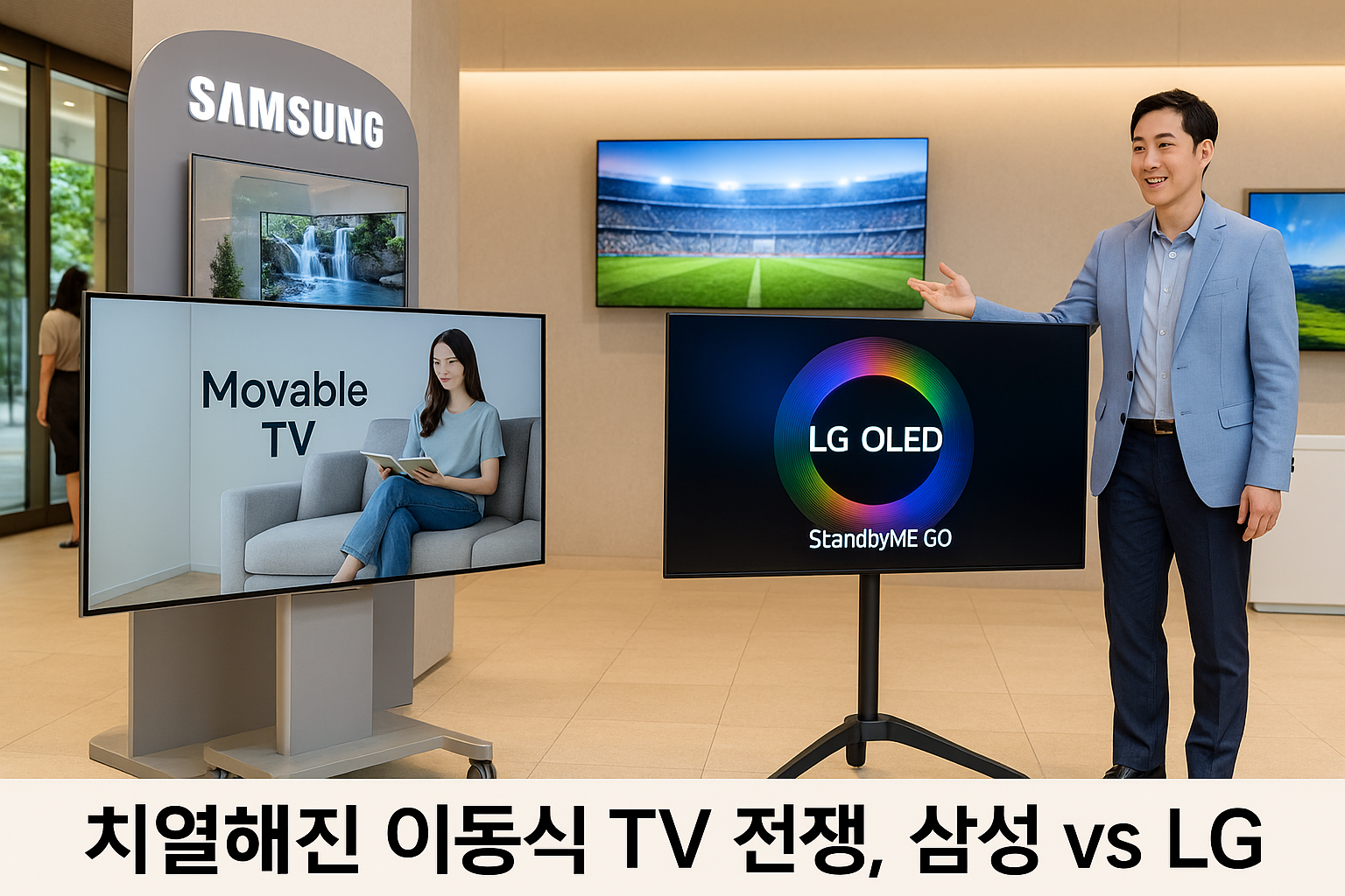 이런 흐름에 맞춰 삼성전자와 LG전자가 정면으로 맞붙었습니다. LG는 먼저 시장에 진입해 '스탠바이미(StanbyME)'로 좋은 반응을 얻었고, 삼성은 최근 OLED를 적용한 '무브뷰(Move View)'로 반격에 나섰습니다.