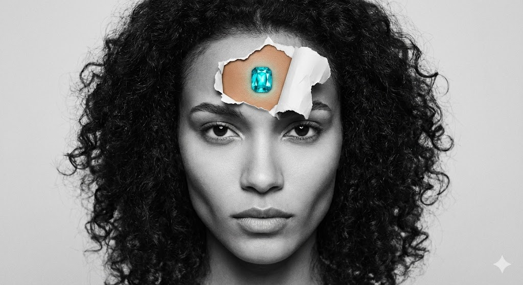 A photorealistic close-up portrait of [a young woman with curly dark hair and striking facial bone structure]. The image uses a selective color and torn paper collage effect. The majority of the photo is in high-contrast black and white with soft, even lighting. A section around the [center of the forehead] features a realistic torn white paper illusion being pulled away, revealing full natural color underneath. Inside this revealed colored section, show [smooth olive skin tone and a brilliant, glowing turquoise gemstone embedded in the skin]. The subject has an intense, direct gaze. Capture straight-on at eye level. Highly detailed texture, cinematic feel.