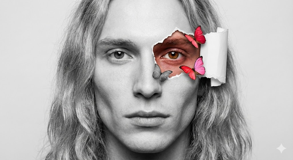 A photorealistic close-up portrait of [subject description: e.g., a gender-neutral person with a slender face, strong defined features, and long, wavy blonde hair]. The image uses a selective color and torn paper collage effect. The majority of the photo is in high-contrast black and white with soft, even lighting. A section around the [location of tear: e.g., right eye] features a realistic torn white paper illusion being pulled away, revealing full natural color underneath. Inside this revealed colored section, show [details inside the tear: e.g., reddish-brown skin tone, a brown eye looking intensely at the viewer, and small vibrant red/pink butterflies]. The subject has an intense, direct gaze. Capture straight-on at eye level. Highly detailed texture, cinematic feel.
