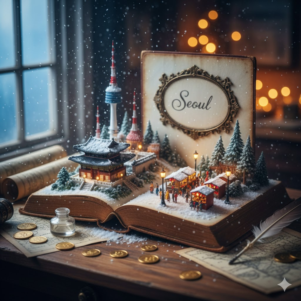 3. 전통과 현대의 조화, 서울 (Seoul) A hyper-realistic, whimsical miniature world of Seoul magically rising from the open pages of an antique leather-bound book. The scene features iconic landmarks of Seoul dusted in heavy snow, with tiny glowing streetlamps and a bustling Christmas market. The book rests on a rustic oak desk surrounded by vintage maps, a quill, and scattered gold coins. The page header reads “Seoul” in elegant calligraphy. Atmospheric lighting: a blend of frosty blue window light and warm amber festival lights. Technical specs: Macro photography, tilt-shift lens effect, intense bokeh, volumetric snow particles, highly detailed textures, 8k resolution, cinematic composition.