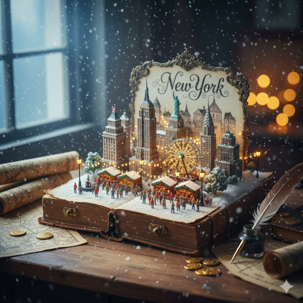 2. 잠들지 않는 도시, 뉴욕 (New York) A hyper-realistic, whimsical miniature world of New York magically rising from the open pages of an antique leather-bound book. The scene features iconic landmarks of New York dusted in heavy snow, with tiny glowing streetlamps and a bustling Christmas market. The book rests on a rustic oak desk surrounded by vintage maps, a quill, and scattered gold coins. The page header reads “New York” in elegant calligraphy. Atmospheric lighting: a blend of frosty blue window light and warm amber festival lights. Technical specs: Macro photography, tilt-shift lens effect, intense bokeh, volumetric snow particles, highly detailed textures, 8k resolution, cinematic composition.