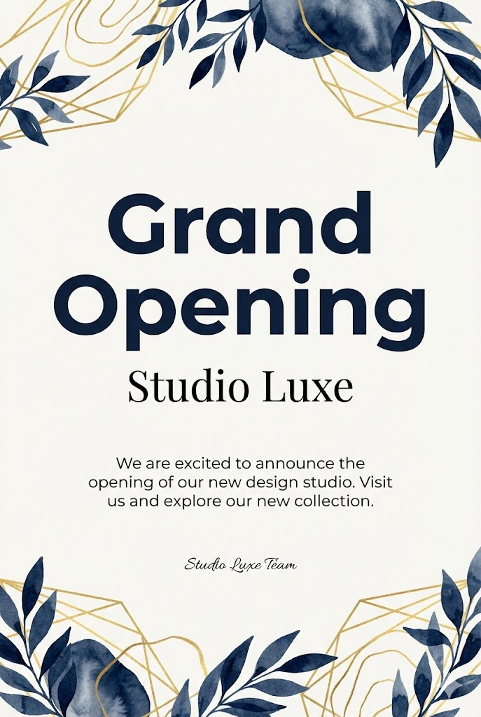 The image must be a direct, flat view of the card design itself, full-bleed edge-to-edge digital graphic card illustration. No borders, no margins, no external background. A vertical 2:3 aspect ratio decorative card template design. The card features a clean, minimalist off-white background. The top and bottom edges are elegantly framed with beautiful, intricate illustrations of geometric gold lines integrated with deep navy blue leaves and abstract shapes in a soft, artistic watercolor style. In the center of the card, there is a structured text layout with varying font sizes: a very large and bold title Grand Opening at the top center, followed by a medium-sized subtitle Studio Luxe below it. In the lower middle section, there is a small-sized body text We are excited to announce the opening of our new design studio. Visit us and explore our new collection., and at the very bottom, a tiny font for the sender Studio Luxe Team. The overall aesthetic is professional, sophisticated, and clean. --ar 2:3