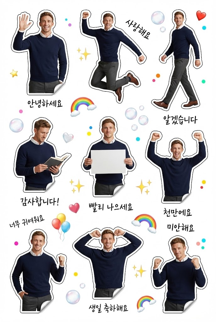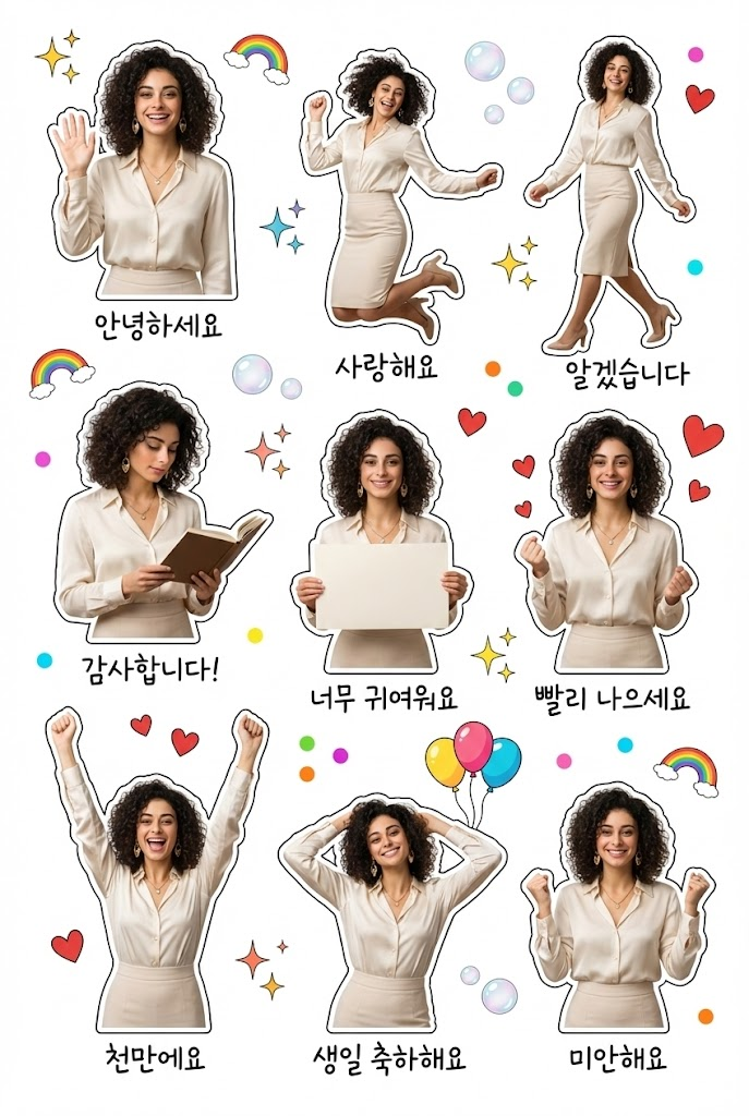 기존의 만화 같은 AI 스티커와는 차원이 다릅니다. 여러분이 원하는 특정 인물의 얼굴 특징을 100% 그대로 유지하면서, 전문 스튜디오에서 촬영한 듯한 극도로 사실적인 퀄리티의 스티커 세트를 만들어줍니다. 자연스러운 메이크업과 트렌디한 의상, 그리고 다양한 포즈와 한글 손글씨까지 완벽하게 구성된 이 마스터 프롬프트를 통해 나만의 유니크한 스티커를 제작해보세요.