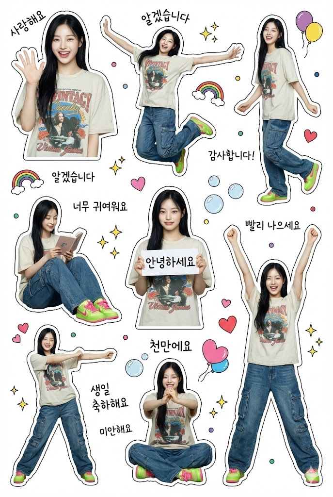기존의 만화 같은 AI 스티커와는 차원이 다릅니다. 여러분이 원하는 특정 인물의 얼굴 특징을 100% 그대로 유지하면서, 전문 스튜디오에서 촬영한 듯한 극도로 사실적인 퀄리티의 스티커 세트를 만들어줍니다. 자연스러운 메이크업과 트렌디한 의상, 그리고 다양한 포즈와 한글 손글씨까지 완벽하게 구성된 이 마스터 프롬프트를 통해 나만의 유니크한 스티커를 제작해보세요.
