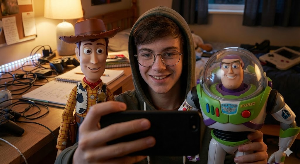 A hyper-realistic selfie shot taken by a [curious teenage boy with glasses] posing closely with [Sheriff Woody and Buzz Lightyear] from the animated movie [Toy Story]. They are situated in [a messy but cozy bedroom desk full of gadgets]. The animated characters retain their signature high-quality 3D CGI texture but blend seamlessly into the real-world lighting and environment. Both are looking at the camera with happy expressions, creating a heartwarming atmosphere. Incredible details, realistic skin texture for the human, depth of field, 8k resolution, shot on smartphone camera style.