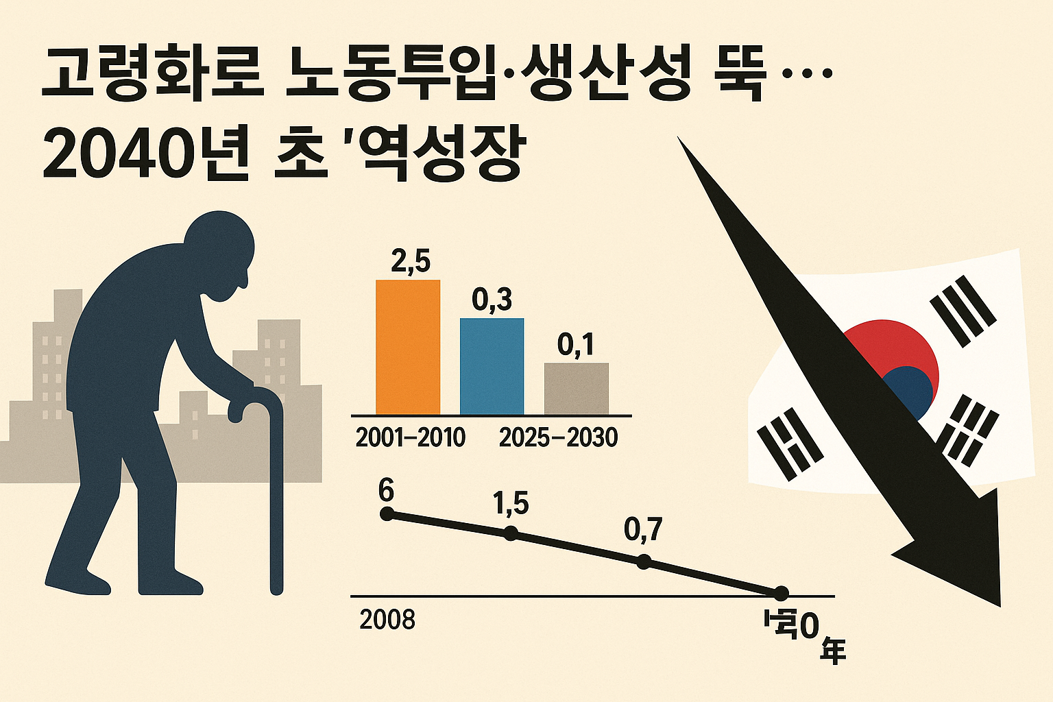 이 수치는 단순히 낮아지는 정도가 아닙니다. 세계적인 수준에서 보더라도 한국의 성장률 감소는 가장 급격하며, 일본보다도 더 빠르게 노쇠해지는 경제 구조를 드러냅니다.