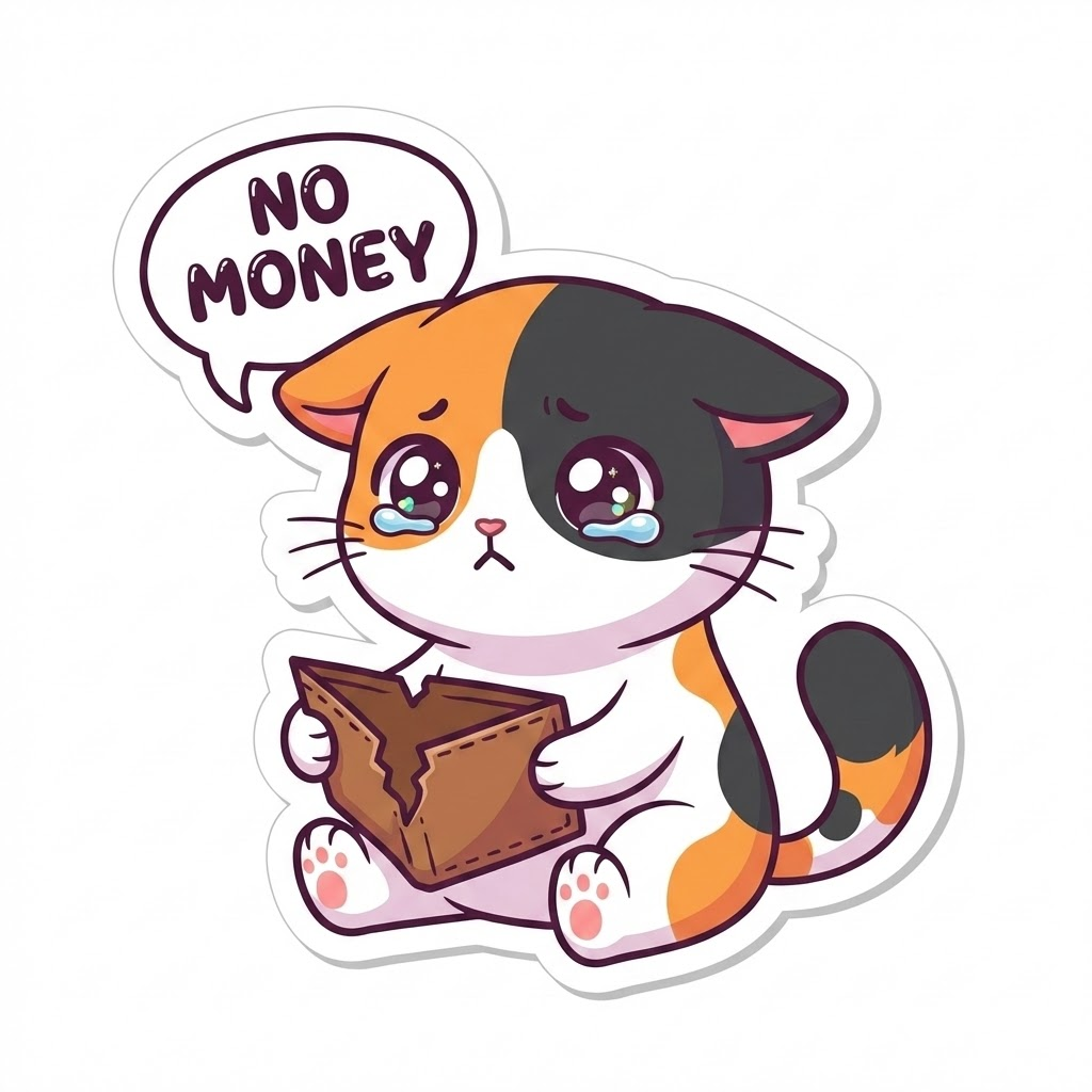 Calico cat sticker, showing an empty wallet with tears in eyes, cute chibi style, vector illustration, flat colors, clean lines, white thick die-cut border, expressive big sparkly eyes, speech bubble with text "NO MONEY", playful cartoon font, vibrant and pastel colors, simple shading, white background --ar 1:1