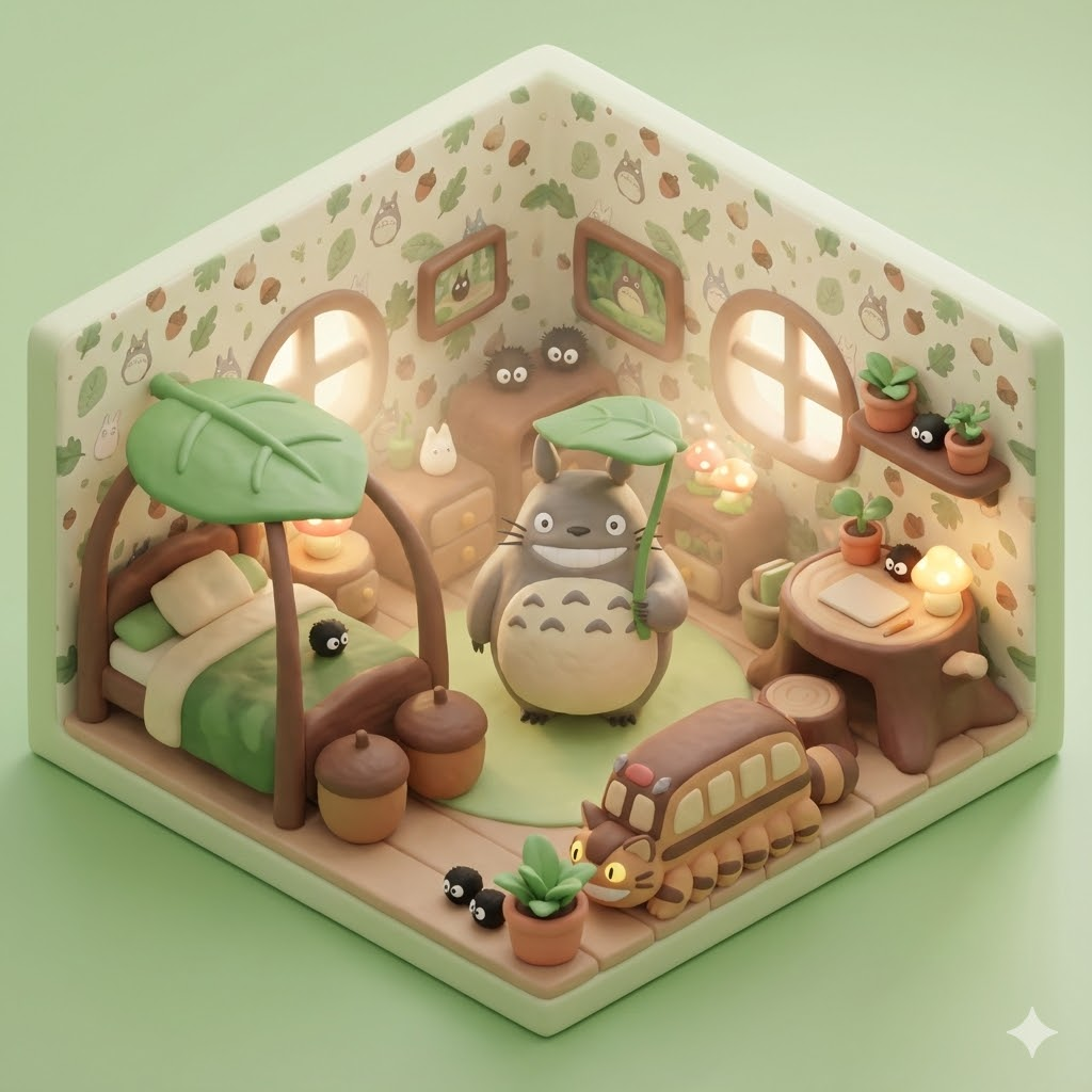 Isometric 3D render, adorable kawaii style, clay render texture, vibrant pastel color palette, dreamy atmosphere, soft cinematic lighting, volumetric fog. A miniature diorama of a themed bedroom designed for [Totoro]. The character, [Totoro], is seen [holding a small green leaf umbrella] in the center of the room. The room is crowded with themed furniture, tiny decor, unique lamps, and playful wallpaper inspired by their universe. All elements are highly detailed miniature models with soft gradients and rounded edges, cute cartoon aesthetic. --ar 1:1