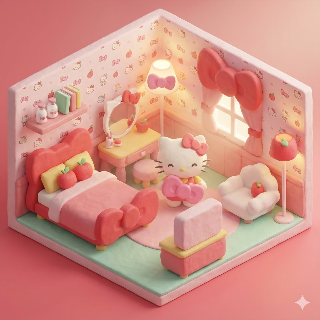 Isometric 3D render, adorable kawaii style, clay render texture, vibrant pastel color palette, dreamy atmosphere, soft cinematic lighting, volumetric fog. A miniature diorama of a themed bedroom designed for [Hello Kitty]. The character, [Hello Kitty], is seen [holding a pink ribbon and smiling] in the center of the room. The room is crowded with themed furniture, tiny decor, unique lamps, and playful wallpaper inspired by their universe. All elements are highly detailed miniature models with soft gradients and rounded edges, cute cartoon aesthetic. --ar 1:1